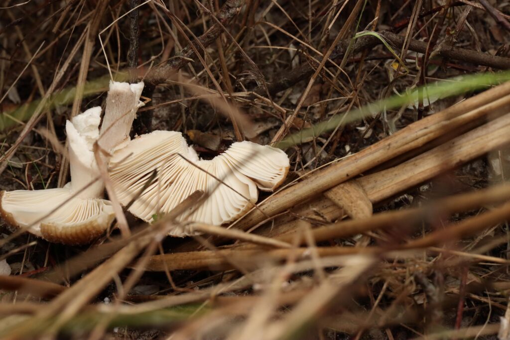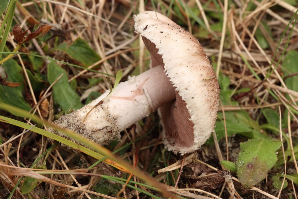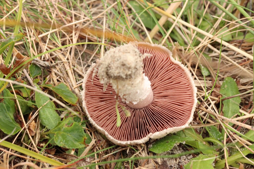 Klit-champignon. trævlet i randen, flosset stok under ring. Foto Fjord